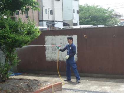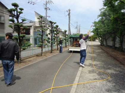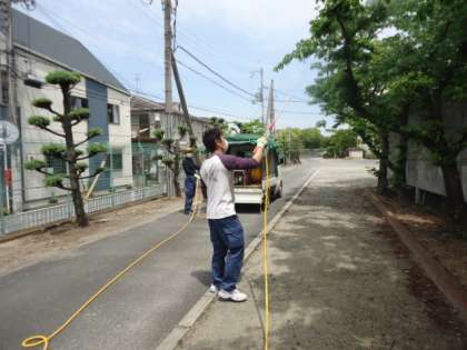 暑い中、市内の校務員さんが殺虫薬剤散布をしてくれています。