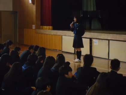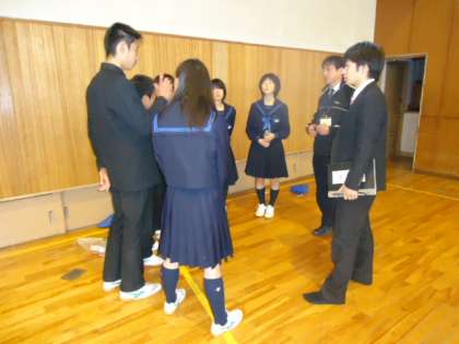 集会が終わった後、先生を交えて生徒会役員は今日のふり返りをしています。
