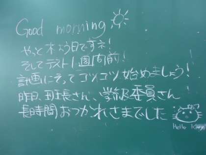 2年1組の担任の先生は毎朝、黒板に生徒向けのメッセージを書いています。