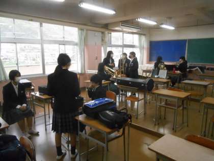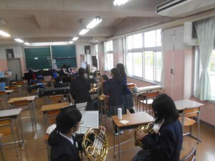 吹奏楽部です。昨日見学したときは1年生が帰った後だったのですが、今日は1年生も練習していました。それどころか、先輩が教えていて、トランペットやホルンが鳴りました。ばんざーいです。みんなで「音出た。音出た。」と喜びました。すばらしい。