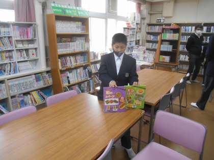 昼休みの図書室に行くと、必ずといっていいほど、うれしいことがあります。今日もボランティアの人がいましたし、1枚目の写真は図書館クイズをクラスでやったときに「数当てクイズ」で正解した二人だそうです。約束の景品をもらっていました。2、3枚目は「先生、僕、料理が好きなんです。」と校長に話しかけてくれた生徒です。大好きな料理の本を手にうれししそうでした。それを見て、私までうれしくなりました。ありがとう。