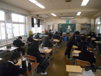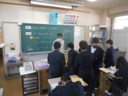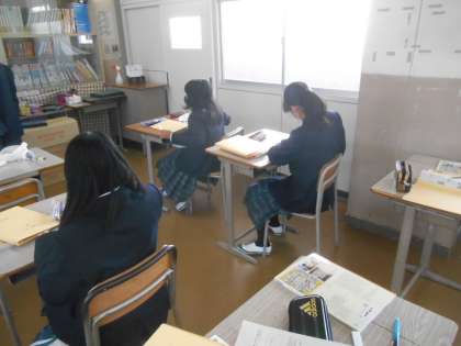 初めての美術の授業です。先生の自己紹介の後、生徒自身のプロフィール画のようなものを制作していました。