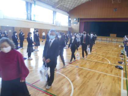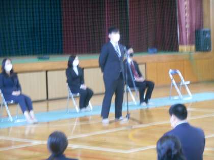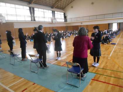 一人ずつ、あいさつを頂き、代表生徒から花束を贈りました。生徒会役員の皆さんが花束を贈ってくれました。もらった先生たちも喜んでいました。最後は花道を通り、拍手の中を歩いて退場となりました。