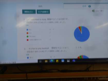 タブレット上で回答した内容が先生のPCに送られ、正解率、間違った人はどう間違えたのか、すぐに分かるようになっています。すごいですね。生徒が間違いやすいところを瞬時に分かるということは生徒を伸ばすことに大きくプラスになります。すばらしいですね。この英語の先生、「校長先生。今日の授業を見に来てください。」と言われて行ったのですが、なるほど、すごい授業でした。