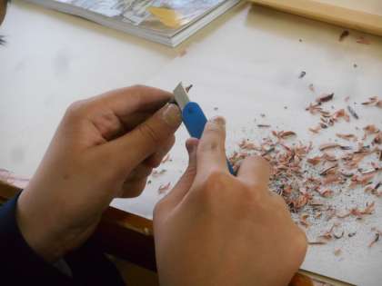 さすがに美術です。鉛筆を電気鉛筆機ではなく、自分で削っていました。こうすることで、独特な線が書けます。