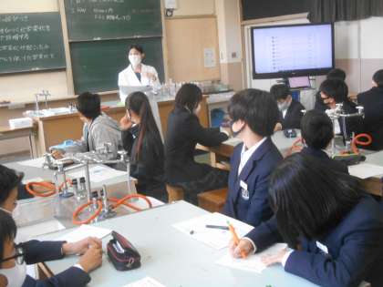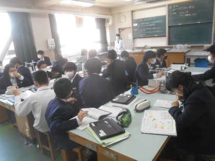 鉄と硫黄が結びつく化学変化を原子のモデルで説明するというめあての授業です。さすが、中学生という難しそうな問題ですね。集中して聞いていました。すばらしい。