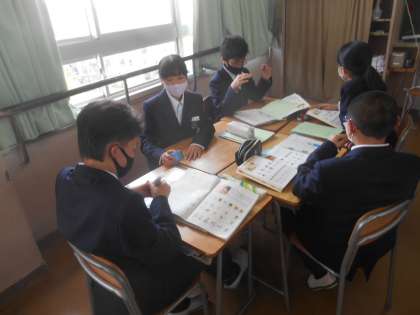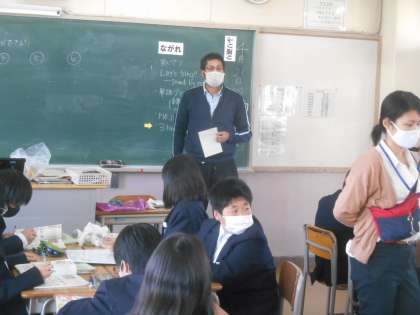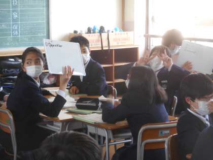 5限の1年生の英語の授業です。AETの先生が、英語で三つヒントを出します。その三つのヒントから連想するものを英語で答えるというクイズをしていました。小学校で習った英語をヒントにしています。