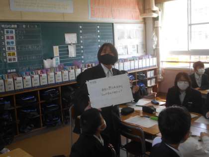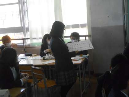 これは、「授業中に強引に話しかけられたときの返し方」を班で交流した後に発表しているところです。よく考えられたものばかりでした。