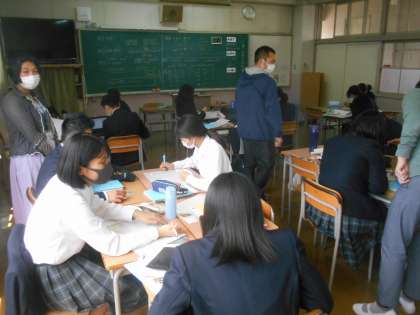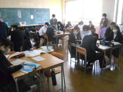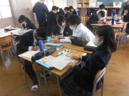 3年生の数学です。因数分解を習いました。先生の作った問題プリントを解いています。あちこちで学び合いが始まっていました。いい雰囲気です。