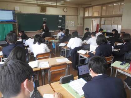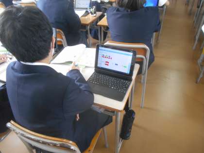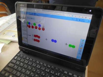 この授業もとても興味深いものでした。分子モデルをタブレット上に表し、指で動かしながら化学式を考えて居ました。水は水素2分子と酸素1分子というようなことをモデルで表しているように見えました。こんなことが当たり前にできることに驚きを隠せません。生徒は当然のようにやっていました。タッチペンがあるともっとやりやすいでしょうね。