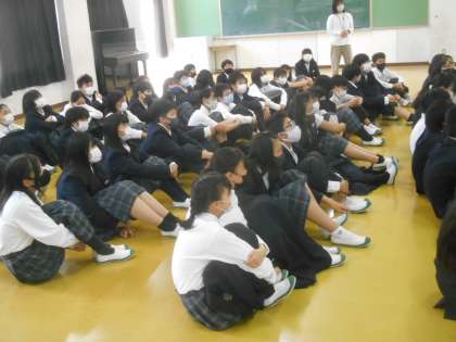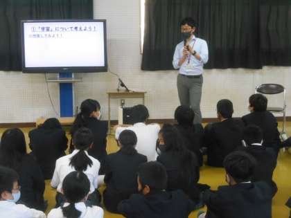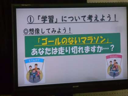 1年生が学年集会で中間テストや期末テストがなくなり、単元テストになった理由などについて先生から話を聞きました。写真は、勉強をマラソンに例えて、「次の電柱までがんばろう、という風に短い期間で目標を立てるとがんばりやすい。」という話をしているところです。
