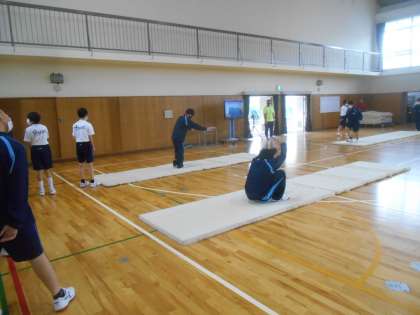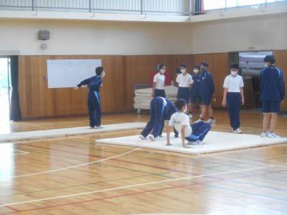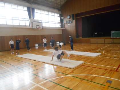 男子は器械体操の授業が始まりました。今日は前転、後転からです。