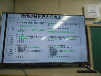 幕末と明治を比較し、明治時代の特色を説明できるようにしようという授業でした。身分制度や地租について、教科書を見て、比較していました。
