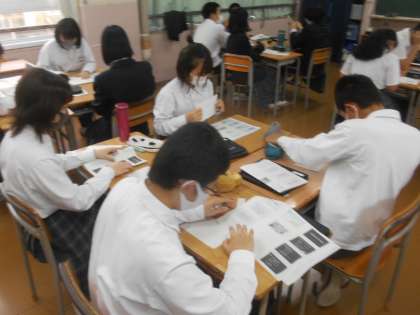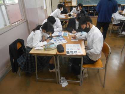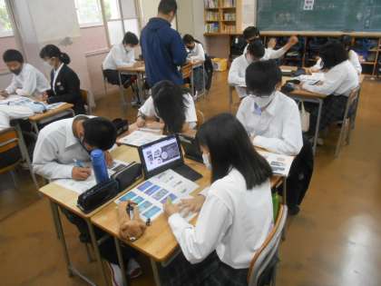 総合的な学習の時間です。修学旅行の取り組み時間です。班ごとに調べたことを発表し終わったところです。