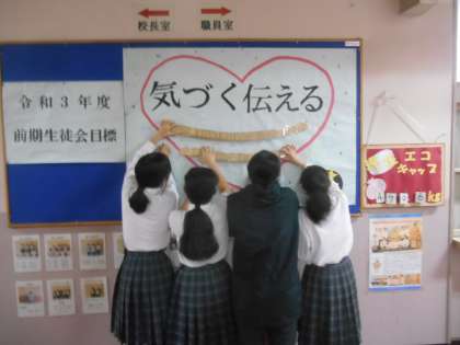 放課後です。前期生徒会役員の人たちが、先日決まった前期の活動目標を掲示していました。「気づく 伝える ( )」この( )の中には生徒や先生たちが各自、自分の意見をもとうということです。校長なら「気づく 伝える 支え合う」と思います。その