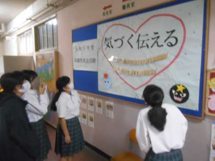 ( )のところを全生徒に書いてもらい、絵馬のようにしたものが2枚目に写っています。なるほど、このハートマークの中に全生徒の気持ちが入っているということですね。すばらしい。