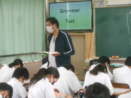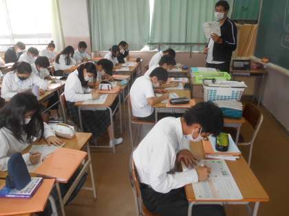 写真では伝わりませんが、AETの先生が英語の文章を読んでいます。それを聞いて(その内容から)プリントの問題に解答していました。ものすごく緊張感が漂っていて、良い瞬間でした。すばらしい。