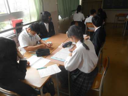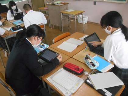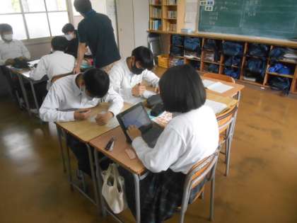 今までもそうでしたが、この数学の授業は「班全員がプリントを解けるようになる」というめあてのときは、特別に集中力が高いです。タブレットを使っている人は、自分は渡されたプリントが解けて、教える人もいなくなると、「数学」というところをクリックしてPC内の問題を解いているところです。解答すると自動採点してくれます。こんなことができるんですね。