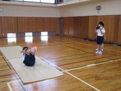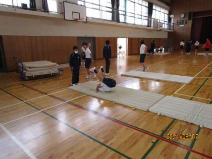 今度は2年男子の体育です。この授業ではタブレットで友人の演技を記録して、互いに見ていました。自分の演技を見ると、修正するところがよく分かります。