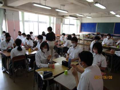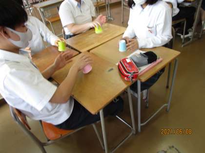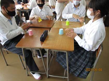 リズムに合わせて紙コップを机にコンコンさせ、隣の人に回していました。みんな上手です。おもしろい授業をしますね。