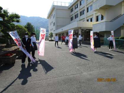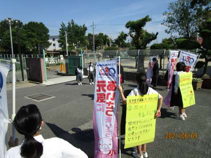 今日は朝から少し暑かったです。生徒会役員の人と生活委員の人たちがあいさつ運動に参加しました。ありがとう。