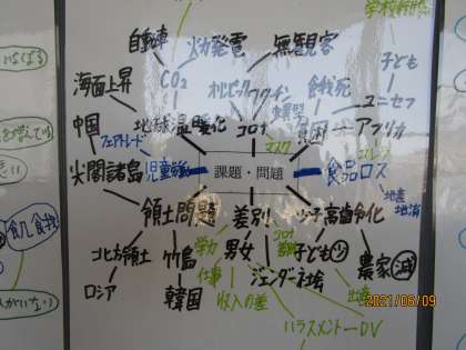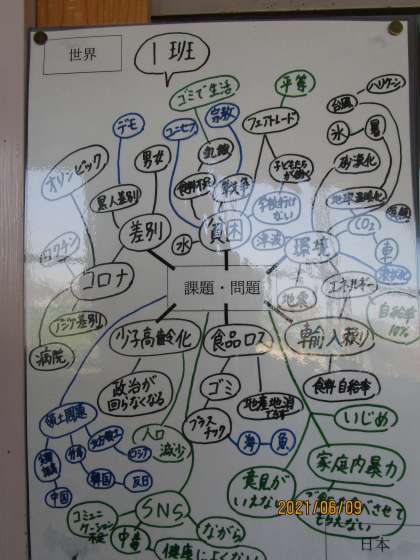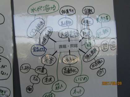 班ごとに心に浮かんだことをマインドマップにしてみました。貧困、差別、飢餓などの言葉が見られます。2年生の学年職員室の廊下に掲示してあります。