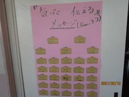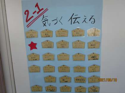 今年度の生徒会前期目標が「気づく 伝える 〇〇〇〇」というに決まりました。○○〇〇のところは自分で決めるということです。2年生ではそれを各自決定し、クラスで公表しました。