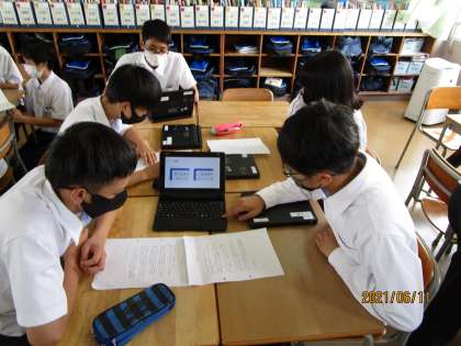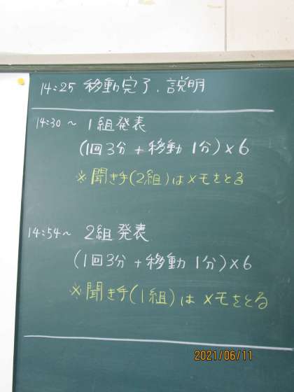 2年生の人権総合学習です。今日の発表に向けて準備してきました。まずは自分のクラス、班の中で調べてきたことを発表します。全員が一人3分間で発表することになります。この「全員が発表」というところがみそです。いろいろな場で自分の考えを述べる、伝えるということは社会人になっても必要なことです。しかし、苦手な人にはとてもつらく、しんどいことです。でも、全員が立派にやりとげました。もちろん、互いに支え合いがあったと聞いています。それがまた、むちゃくちゃうれしいのです。