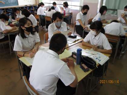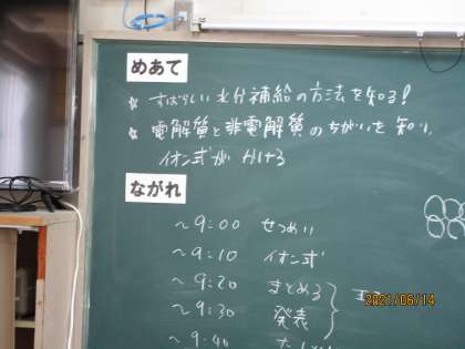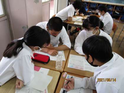 3年生の理科の時間です。担当の先生が、「今日の理科の授業では熱中症のことを学習します。」と言うので、驚いて見に行きました。イオン、電解質といった言葉が黒板にあり、生徒の口から発せられています。調べるだけでなく、調べて分かったことを順番に発表し合い、理解を深めていました。レポートもしっかり書いていました。