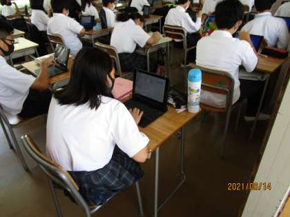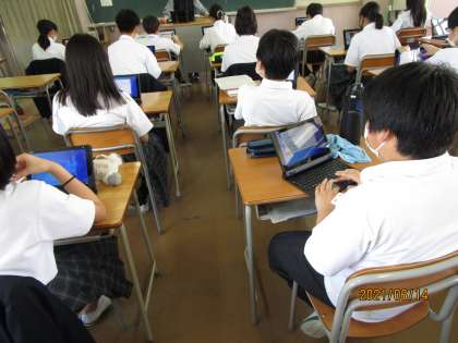 1年生の国語です。会社に入ってパワーポイントを使うかどうかは分かりませんが、人に説明するということは多くの場合には必要です。そのためにも国語の時間に聴いている人に分かりやすい資料を作ります。それがPCのアプリ、パワーポイントです。まずは、班で作ってみます。数年前には技術家庭科以外では考えられなかった授業ですが、国語における表現力を伸ばすということでは必須の内容ですね。
