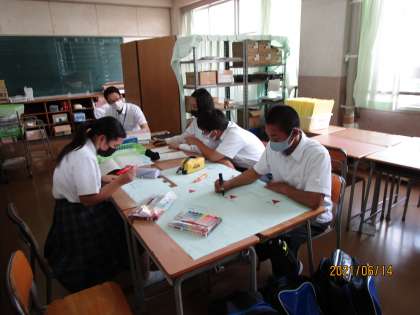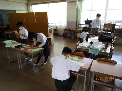 2年生学級委員会、1年生学級委員会です。話をしつつ、作業もしていたようです。学級委員会はふだんからしょっちゅう集まっていろいろ相談しているようです。これもすばらしいことだと思います。みんな、ありががとう。