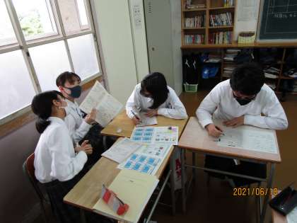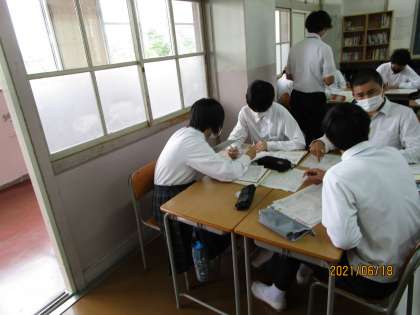 学習班を基本に学び合いをしているところでした。席を離れて教えてもらうこともみとめられていたようです。昨日まで塩化水素や塩化銅を用い、電気分解の実験をしていたことを受け、今日はイオンの問題にチャレンジしています。担当の先生が言うには、今日の問題は難しい上に量が多く、なかなか教えに回る余裕がなかったかもしれないとのこと。さらなる改善が求められます。校長が見ている中では、そうはいっても、「ここ分からないから、教えて」と言う生徒に「わかった。教えたるよ。」というやりとりをして学び合いも見られました。