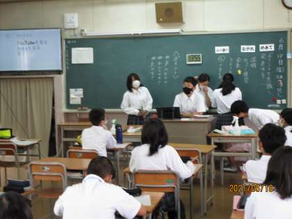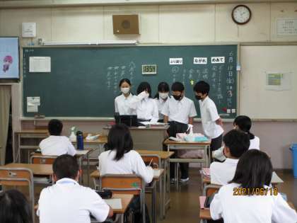 1年生の国語です。この授業もすばらしかったです。自分の好きな食べ物や趣味、タレントなどをタブレットを使ってパワーポイントにして紹介し合いました。全員です。ユーモアたっぷりに紹介する人もいて聞いている人たちも全員笑顔です。見ている私もうれしくなりました。