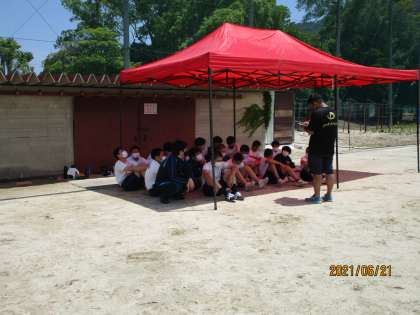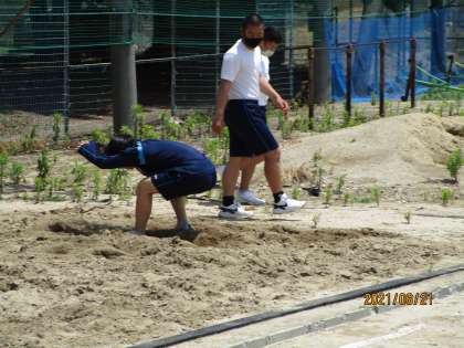 こちらもいい授業でした。先生が、始めは不安げに跳ぶ生徒を「うんうん、始めはゆっくりでいいからな。」と言いながら、少しいい点が見えだすと「よっしゃ、それや。それでいいよ。」と声をかけていくのです。そうしたら、次の試技はまた自信が出て、いい跳び方になっていました。目の前でグングン良くなっていくのが分かりました。今日は、暑くて、グランドに簡易テントを用意しました。