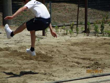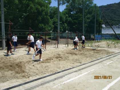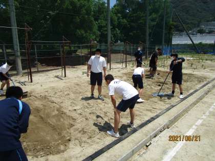 砂場の砂というか土が何回もジャンプしているかたくなります。1組が水分補給しているときに2組の生徒がスコップで掘り起こします。後で交代します。