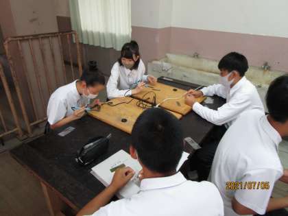 はんだごての練習をしていました。金工室の大きな作業机ですが、4人かけで作業するとはんだごてを使うには狭くて、火傷の危険もあるので、4人ですが、2人ずつの作業としていました。中学校ではんだづけを経験して、多くの人は実生活でははんだづけをしないかもしれませんが、何事も経験ですね。