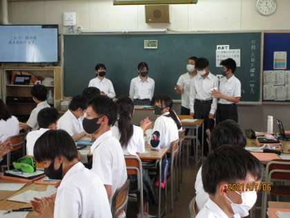 2年生の英語です。1学期に習った内容をグループに割り当て、CANやMEIの使い方、IT is hard for me to study English.などの構文について説明していました。かつ、練習問題を作って考えさせていました。これもすばらしい。