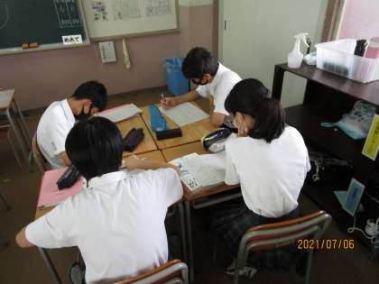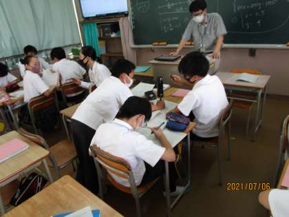 授業後半の演習の時間でした。連立方程式の応用問題をやっていました。少し難しいのでしょうか、あちらでもこちらでも学び合いが始まっていて、どの人も真剣に聞いていました。すばらしい授業でした。
