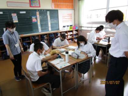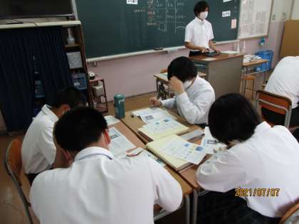 酸とアルカリの勉強をしていました。先生の説明はほんのわずかしかなく、生徒が教科書やネットを検索してプリントの問題にあたっていました。もちろん、学び合いもあります。1年からの積み上げもあるからだと思いますが、すごいなあといつも思っています。内容は決して易しくありません。