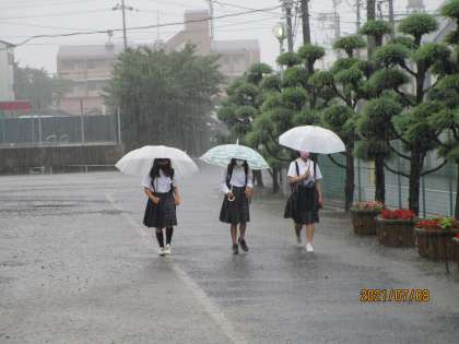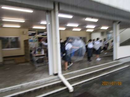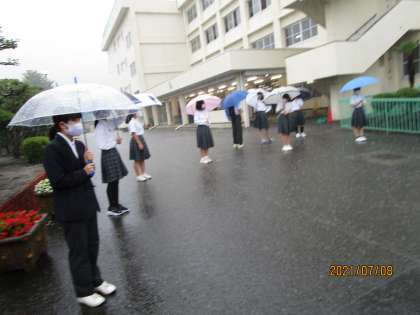 今朝の雨はひどかったですね。特に8時過ぎからは本降りになってきました。そんな中、生徒会役員の人と報道委員会の人があいさつ運動を実施しました。頭が下がります。ありがとう。ちなみに、今日は多くの人が制服のズボンやスカートがびしょにぬれになり、体操服に着替えて過ごすことになりました。