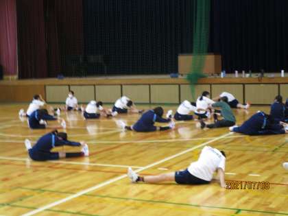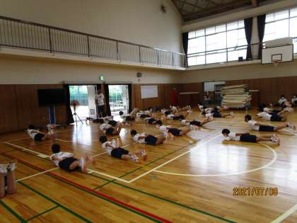 1、2枚目が男子です。授業始めの補強運動です。腕立て、腹筋、背筋、柔軟体操をやっているところです。