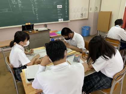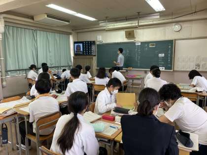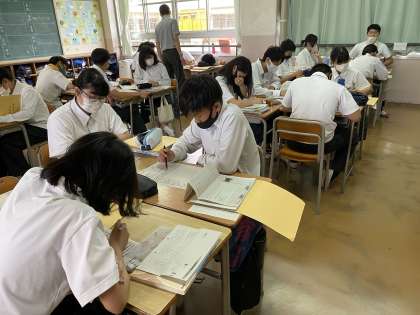 漢詩の学習です。先生が大まかな語句の解釈をしたのち、生徒たちがいわゆる鑑賞文を考えているところです。