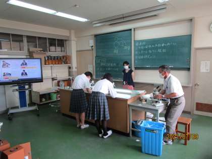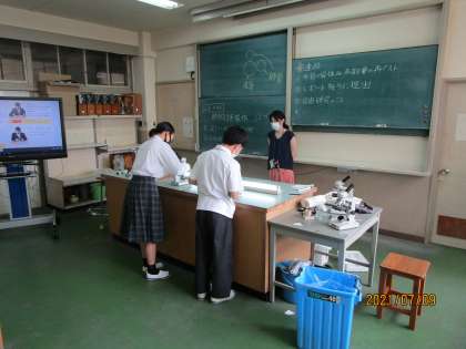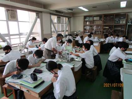 2年生の理科です。実験が続いている授業です。今日は顕微鏡の使い方をマスターできているかどうかのスキル(実技)テストを行いました。これが、けっこう難しくて、課題の対象物をくっきりと見えるように微調整することが求められます。