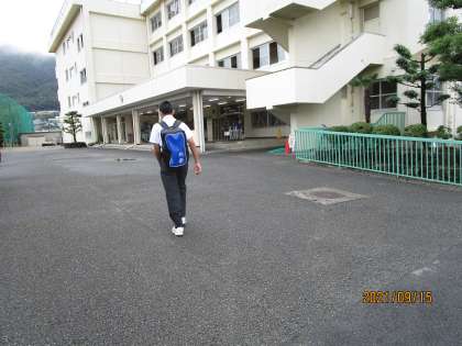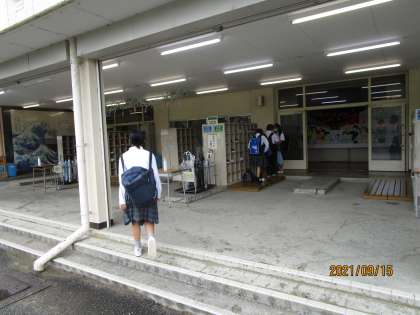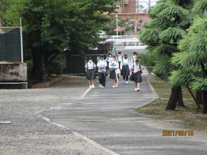 夜中に降った雨で地面が濡れていましたが、雨がやんだだけでも良かったです。生徒たちが登校してきました。
