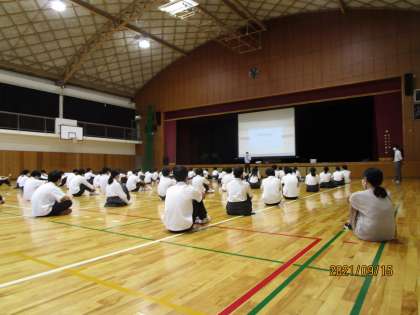 本日の5限に体育館で生徒向けの林間学舎説明会を行いました。冒頭。学年の先生から「本当だったら、給食時間も休み時間も少々大きな声で元気よくおしゃべりして、楽しくやっていってほしい、と思うけど、今はコロナの感染予防が優先。心苦しいです。でも、体育大会も林間も実施するためには、感染対策をしっかり守ってほしい。」と真剣に話していました。きっと、生徒の胸に響いていると思います。そのあと、詳しい行程の説明がありました。