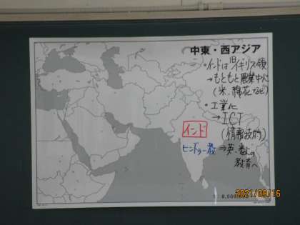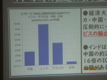 インドではなぜ、数学や英語が特に勉強が熱心なのか、という授業です。インドでは宗教や身分制のことも大いに関係があるとのこと。グラフはインドでは8兆円、日本では5000億円のICT関連のお金が動いているそうです。インドは日本の16倍のお金が動いているとのこと。驚きました。