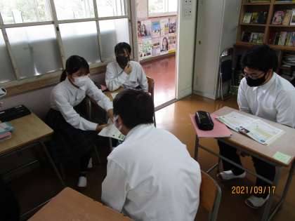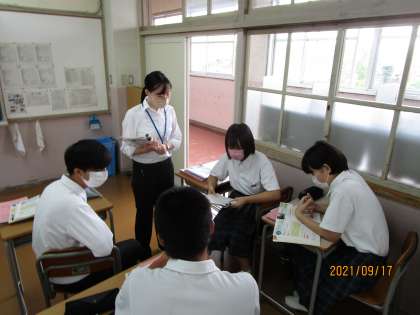授業始めの早押しクイズがまず、大盛り上がりです。生徒の笑顔がすばらしい。続いて、プリントの例文をグループで読んでいます。生徒たち、英語が楽しくて仕方がないようです。