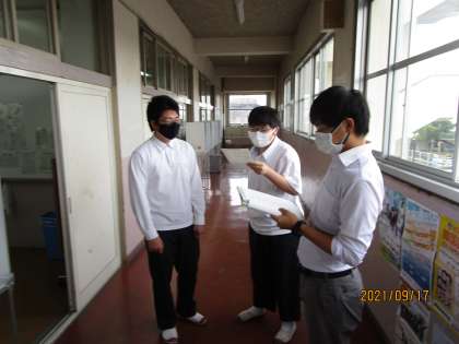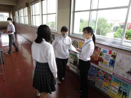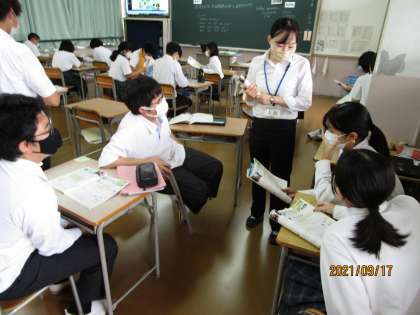 今日のめあてである「英語で道順を聞いて英語で教える」パフォーマンステストしているところです。A評価が欲しくて何度もチャレンジする生徒がいました。すばらしい。