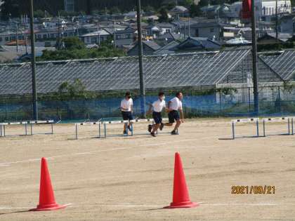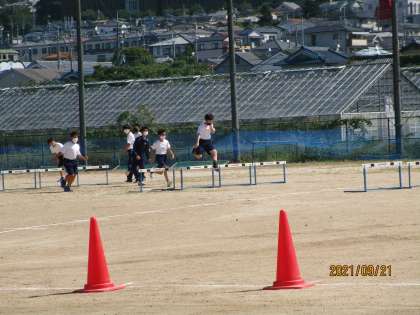 ハードル走です。始めは5分の力で走っています。