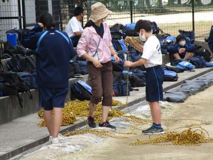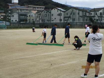 虎ロープのまき直し、グラウンドではライン引きも始まりました。